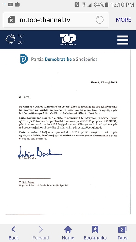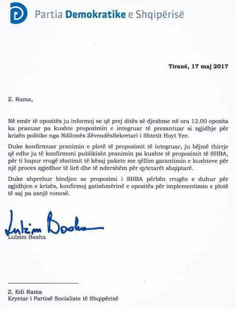 Nuk ka asnjë dyshim se njeriu më i afërt politikisht për Lulzim Bashën është ish kryeministri Berisha të cilin, sipas mediave, Basha e ka takuar dy herë ditën e sotme. PD dhe aleatët e saj vendosin sot nëse do hyjnë në zgjedhje, bazuar në marrëveshjen e shtruar nga McCallister, me disa ndryshime. Sinjalet nga burime pranë Bashës japin arsye për të besuar se mund të ketë një marrëveshje. Paketa McCallister i ofron Opozitës disa poste ministrash, kreun e KQZ-së, zv. Kryeministrin e disa siguri të tjera. Numërimi elektronik mund të jetë një kusht i realizueshëm, por PD mund të tërhiqet nga “votimi elektronik” si një ndërmarrje e pamundur në kohën e dhënë.