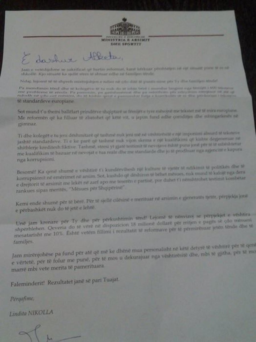 Ministrja e arsimit Lindita Nikolla me rastin e festave të fundvitit i ka dërguar një letër përshëndetëse dhe falënderimi të gjithë mësuesve të arsimit shqiptar duke vlerësuar rolin dhe kontributin e tyre ne rritjen e nivelit te mësimdhënies në shkolla, por njëkohësisht ka marr përsipër edhe difektet dhe përgjegjësitë për përmirësimin e arsimit në të ardhmen.
