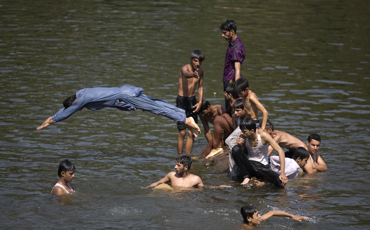 Njerëzit freskohen në një përrua, teksa temperaturat arrijnë 38 gradë Celsius.