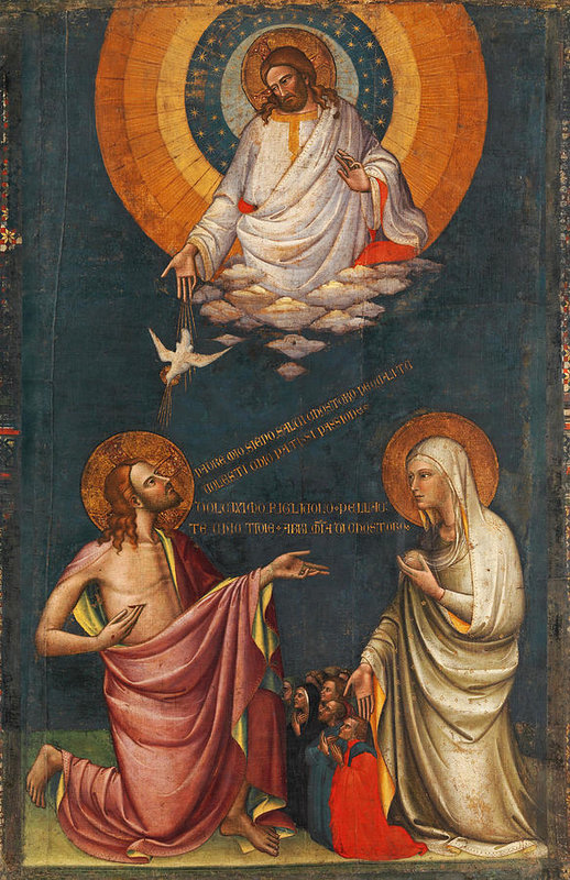 Cristo mostra al Padre le cicatrici delle ferite che sopportò, Maria mostra al Figlio i seni con i quali allattò - Speculum humanae salvationis, Trattato anonimo, secolo XIV.