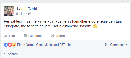Tahiri vete thote,nuk kam dhene doreheqjen ne Facebook-un e tij.