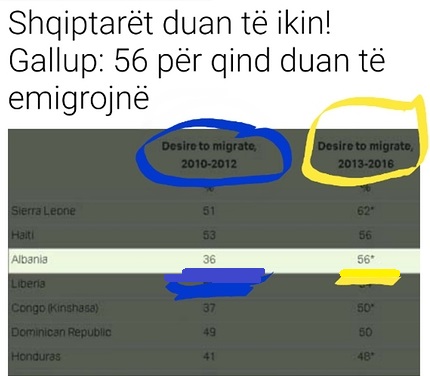 Sipas Gallup, një kompani Amerikane kërkimore e njohur për sondazhet e saj, 56% e shqiptarëve dëshirojnë të largohen nga vendi i tyre, me shpresën për një jetesë më të mirë.
