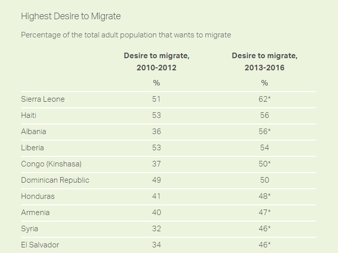 Sondazhi, i kryer në vitet 2013-2016 në 156 vende të botës pyet njerëzit mbi 18 vjeç, pra në moshë madhore, nëse duan të migrojnë në një vend tjetër, dhe nëse po, cili do ishte ai vend. 14% e popullsisë globale, që përkthehet në 710 milionë njerëz, duan të largohen nga vendi i tyre.
