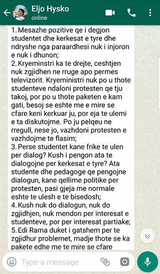 Sa per kete protestaen, sic e kane thene edhe te tjere neper TV keto dite, nis nga nje gje e vogel si shume protesta te tjera, pastaj u zmadhua, u rrit oreksi. Po ajo arsye per te cilen nisi eshte shume e drejte, thjesht ata hajdutet qe jane ne krye duan te gjejne rruge per te bere para. Domethene nisi se duhej te paguanin shtese per provimet e prapambetura a dicka e tille. Edhe une e kam bere shpesh ate gje, per shembull kisha tre provime ne dhjete dite, e lija te mesit qe te kisha me shume kohe per te fundit. Pse duhet te paguaj me shume per kete. Sa per keto kerkesat ultimative a ku di une, tani studentet jane pak si ushtaret, cakmake.